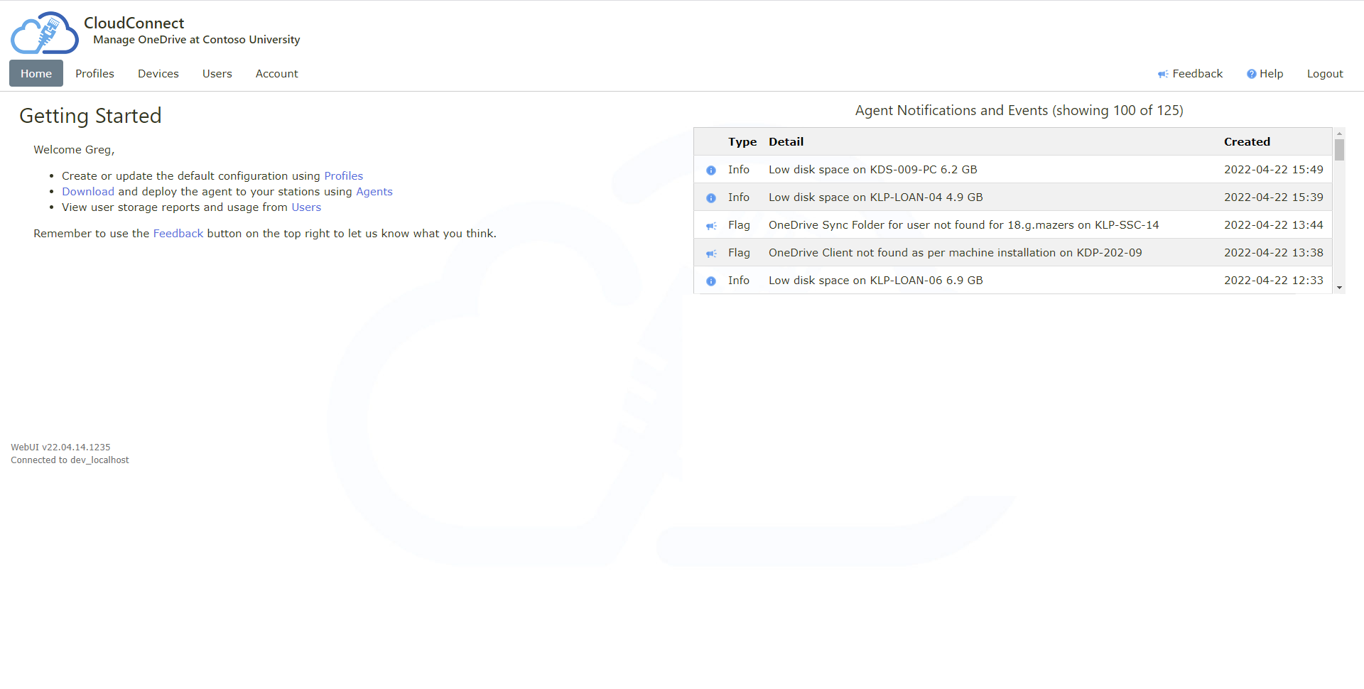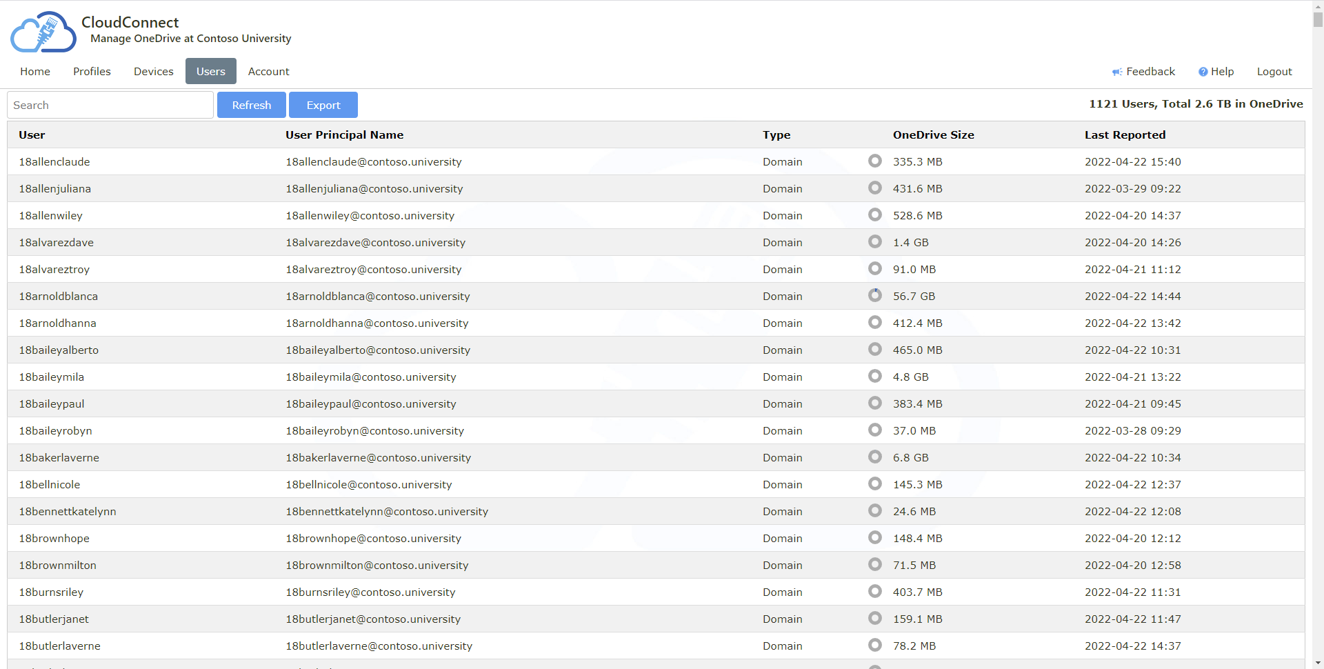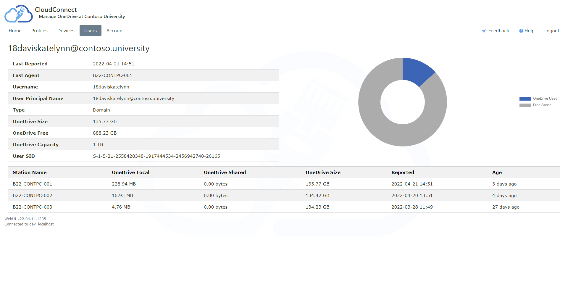 Disk space usage for each user and device is reported centrally